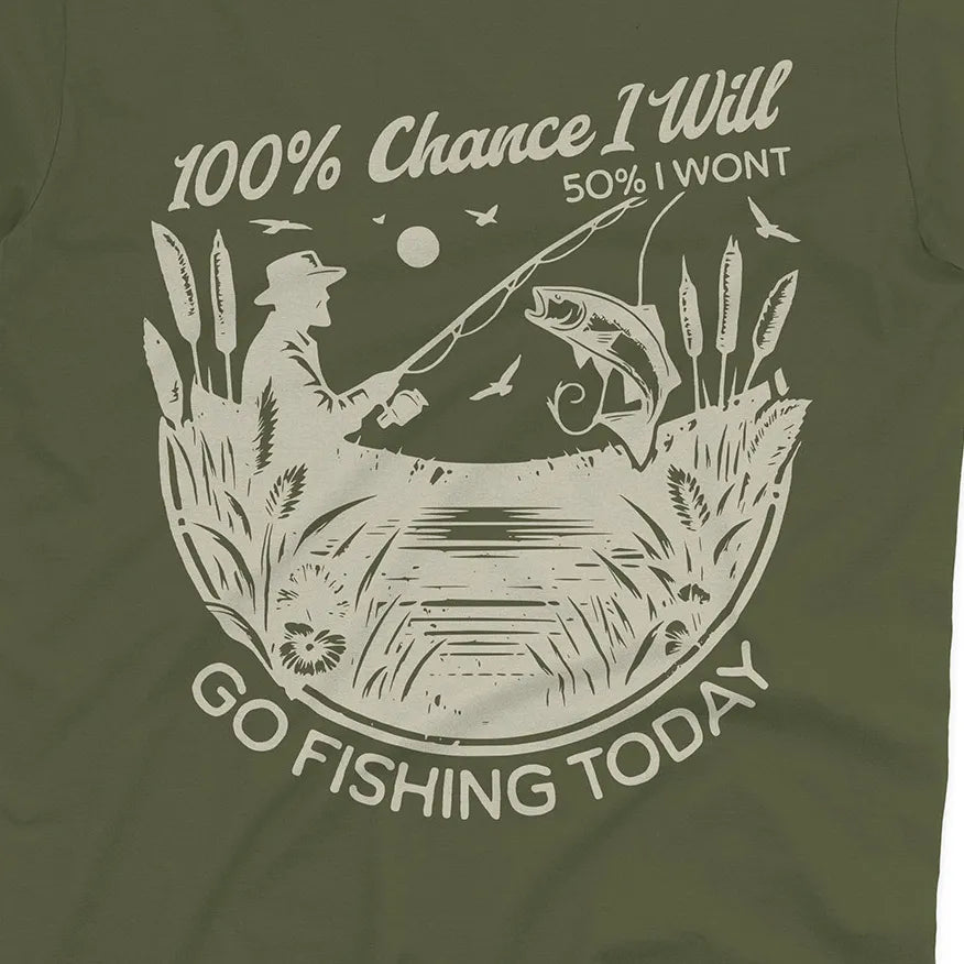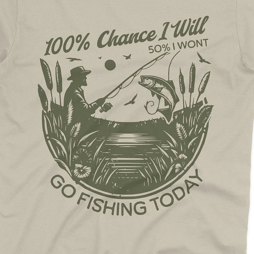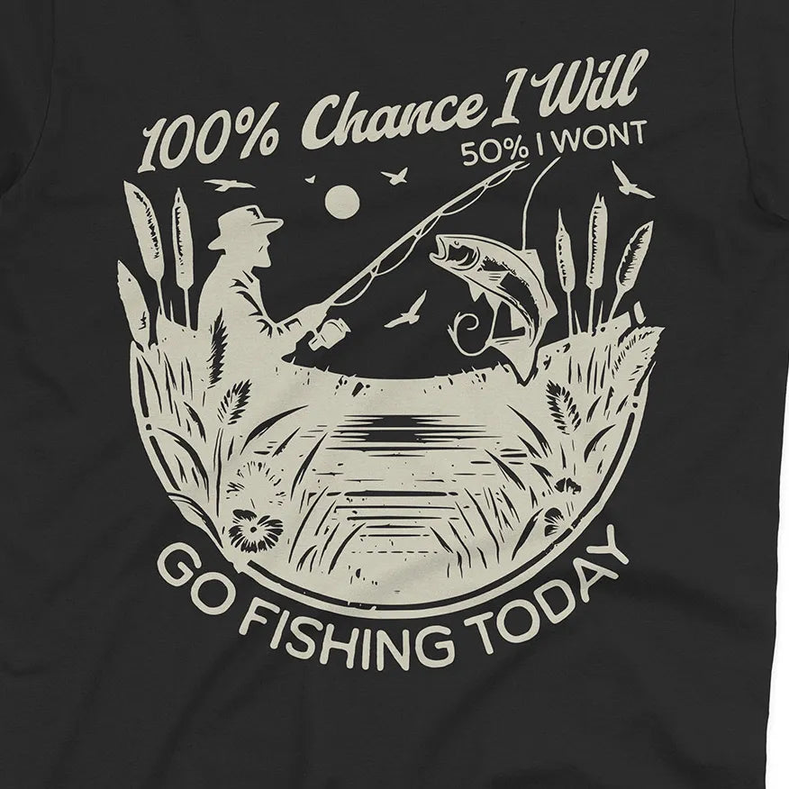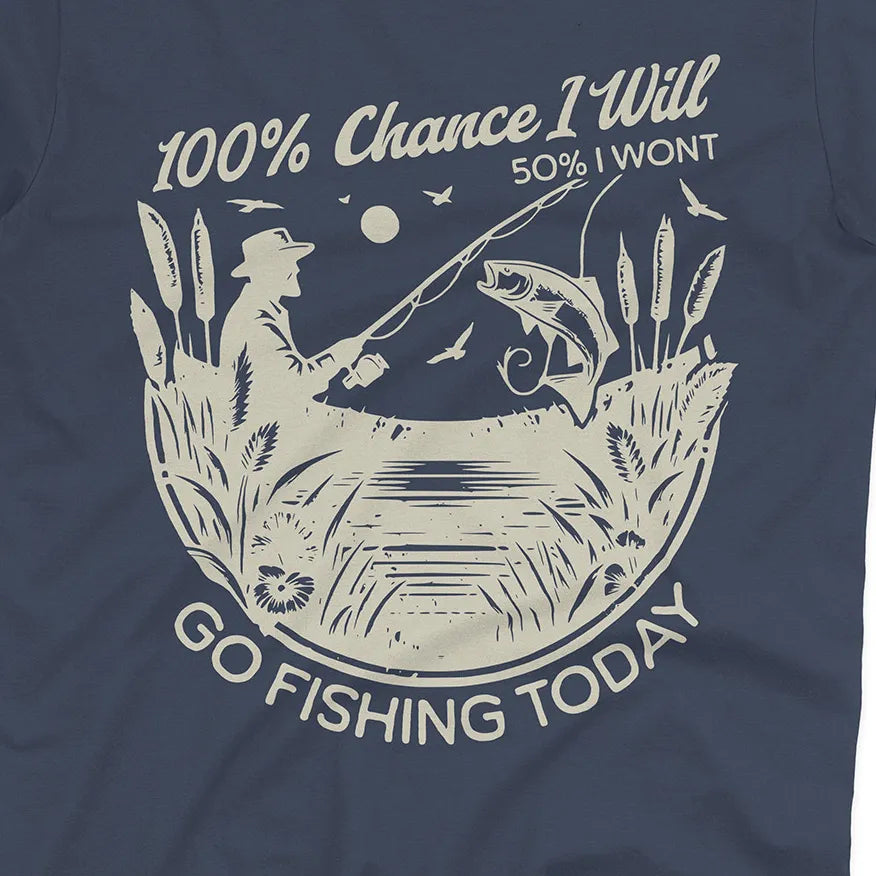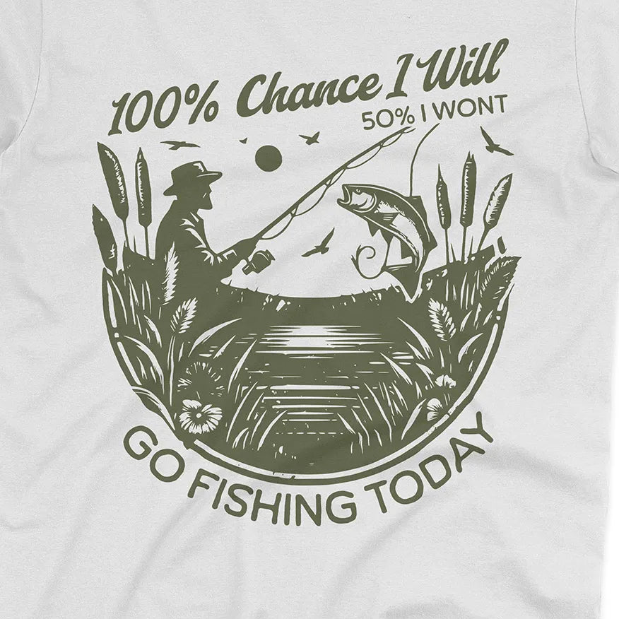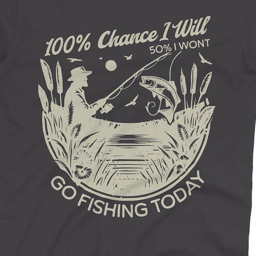 Some days the plans change, but one thing never does – the urge to fish. This playful design says it all: there’s a 100% chance you’ll go fishing, even if life throws in a little uncertainty.