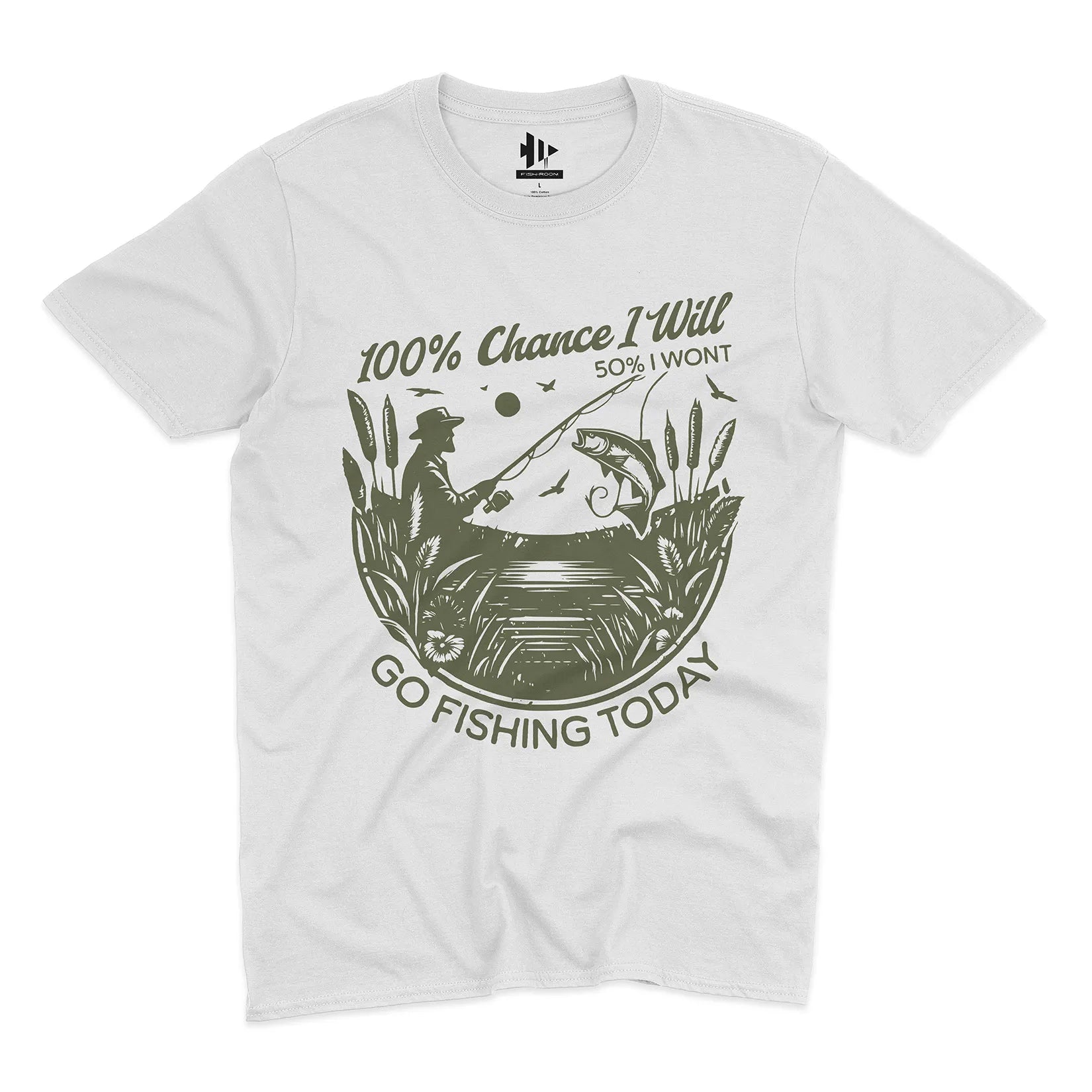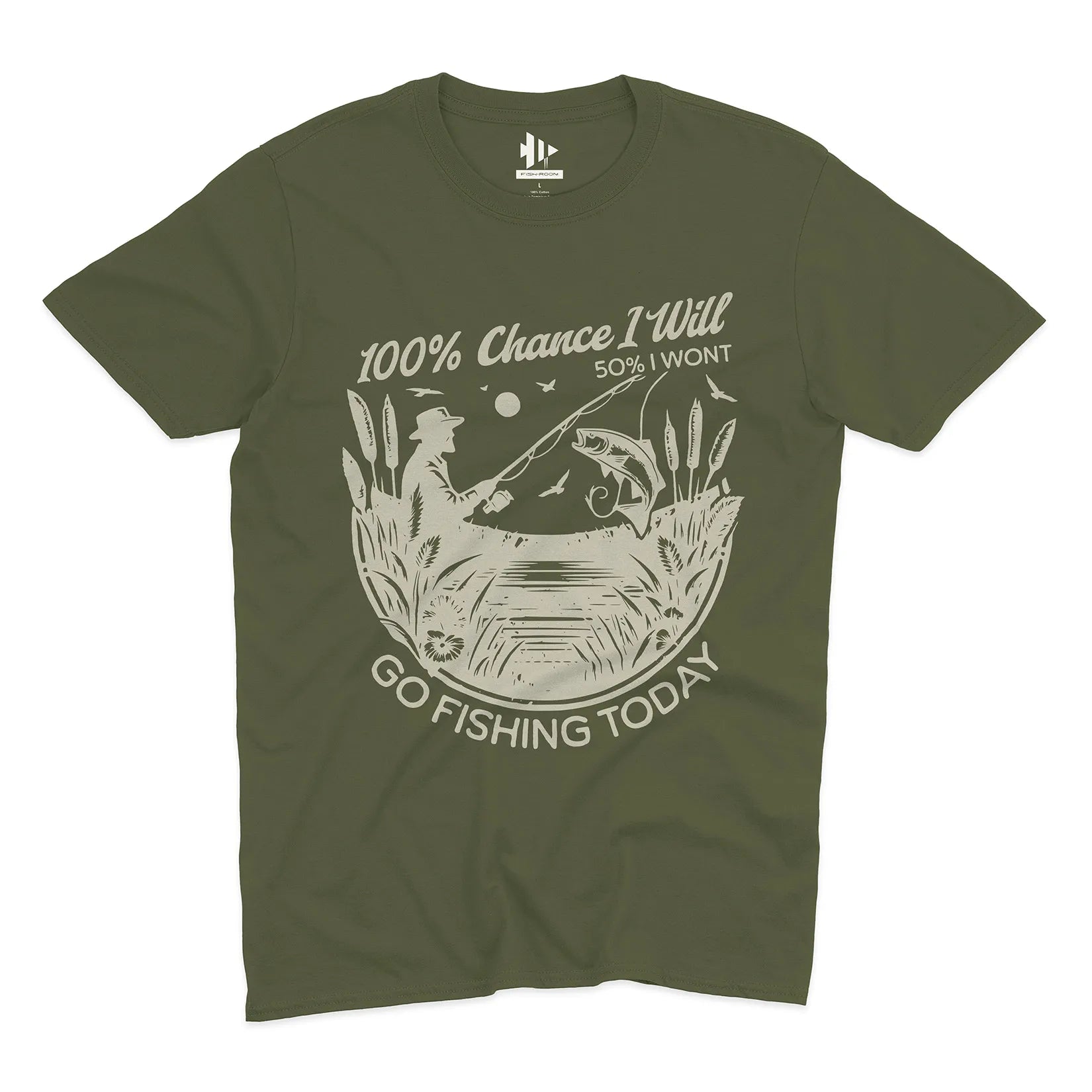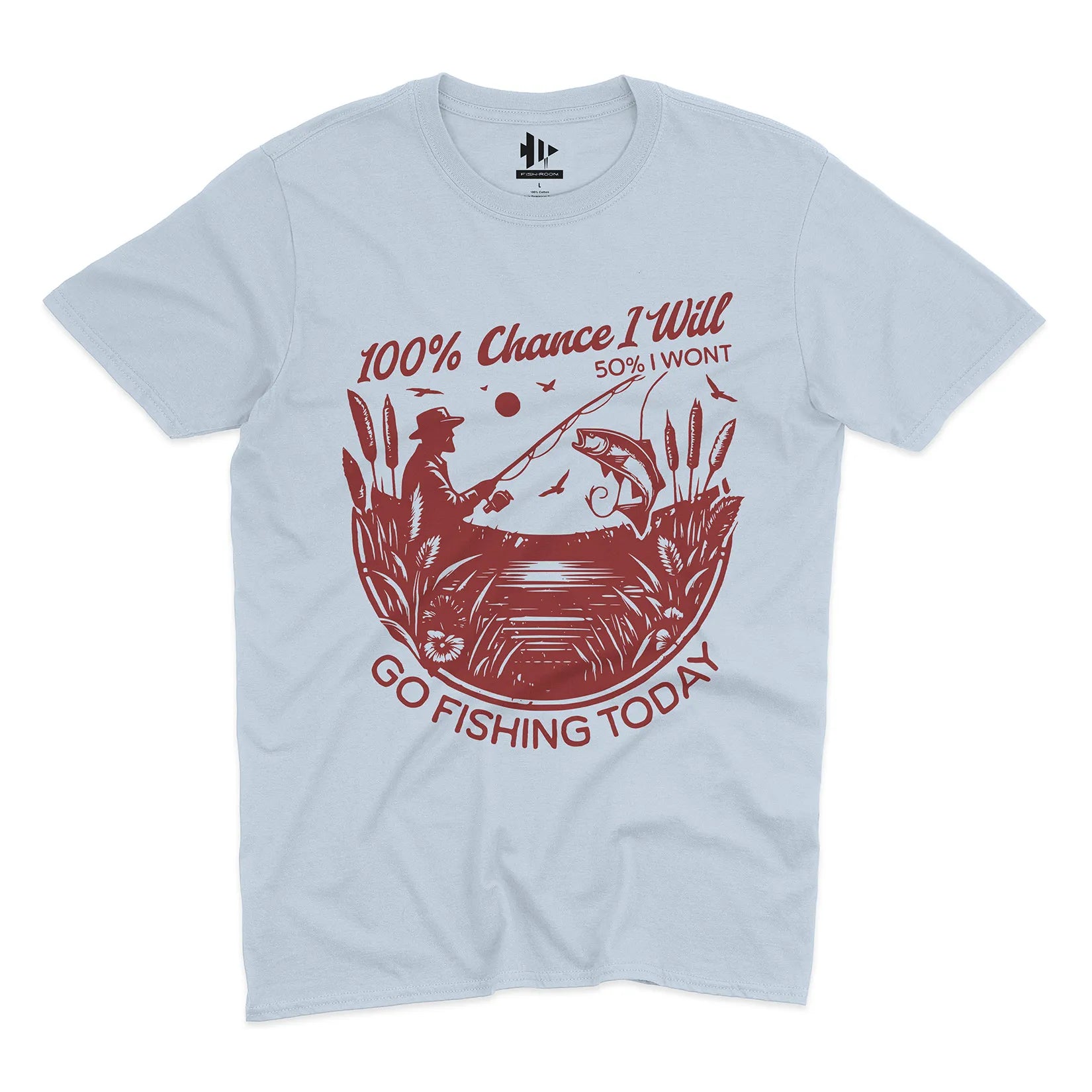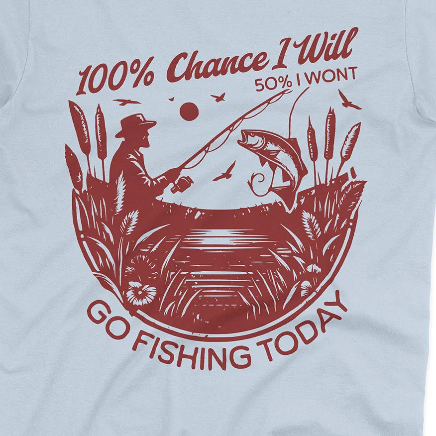 Some days the plans change, but one thing never does – the urge to fish. This playful design says it all: there’s a 100% chance you’ll go fishing, even if life throws in a little uncertainty.