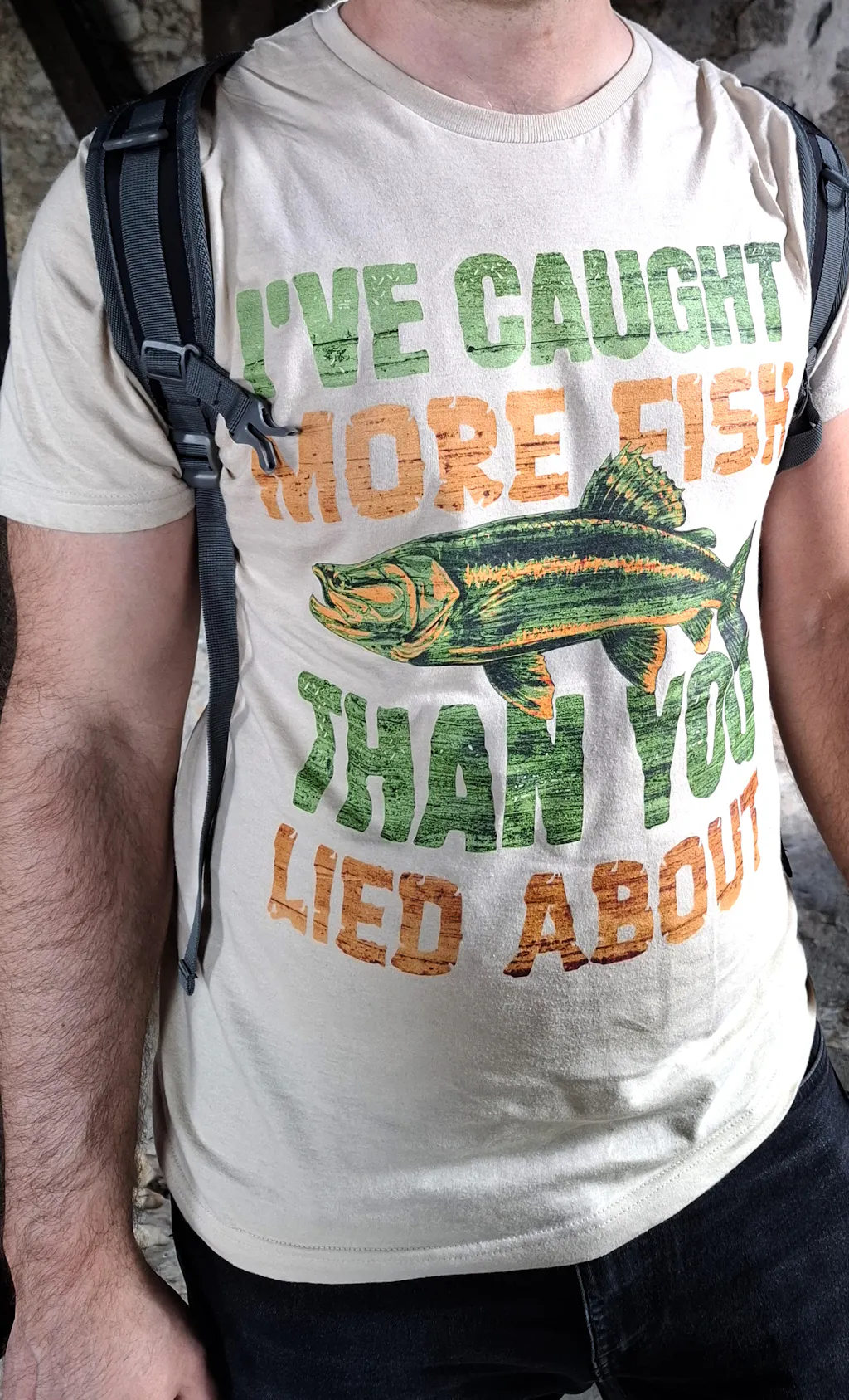 Every angler knows the truth: the stories get bigger as the fish get smaller. That’s why we created this funny fishing shirt – the perfect comeback when your buddy starts bragging about his latest catch.